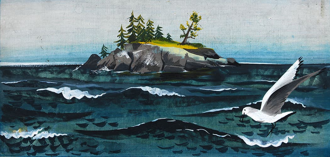 “I’ve watched the mists blow in and hide the little island, sometimes leaving only the pine treetops exposed, hanging in space. I rowed to and from the little island with the seals spawning below the surface of the water,” Weisgard recalled in his Caldecott acceptance speech. “Everything is fast and fleeting around the little island; the sea is never still, the clouds fly quickly into different shapes, the colors change from sunlight to mistlight, the trees are moving and the birds are always flying and screaming. This active little island was too elusive for me to catch in its own time. It was easier to put as much of it as I could wherever it is you store such things, take it home to Connecticut, and remember it all in my own time.”