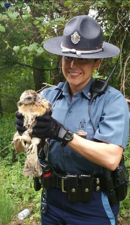 Instead of flying by, State Police Trooper Leigha Genduso stopped, the post said, and helped the pair of bird watchers guide the baby hawk toward the edge of the woods.