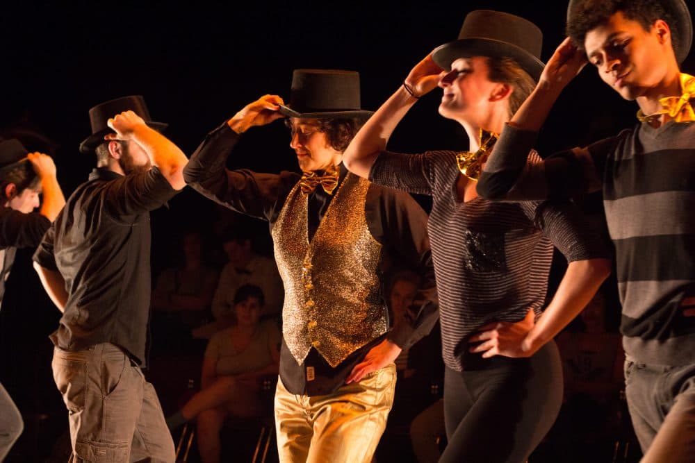 Most of the show is what you might call through-danced, whether it be a ballroom pas de deux between two women projecting the story of their lesbian romance (ironically, to the theme of the 1966 French film “Un homme et une femme”) or a sinewy reenactment of a phalloplasty, complete with clinical description, played out against “One” from “A Chorus Line.” Though much of the evocative visual movement is attributable to Power and the video/projection design of Joey Frangieh, the droll choreography is credited to Eileen Herman-Haase and Raul Nieves. Tyler Kinney’s imaginative costumes cross not only boundaries of gender but of species as well, transforming the performers into mouthless mammals and some pretty cute bears.