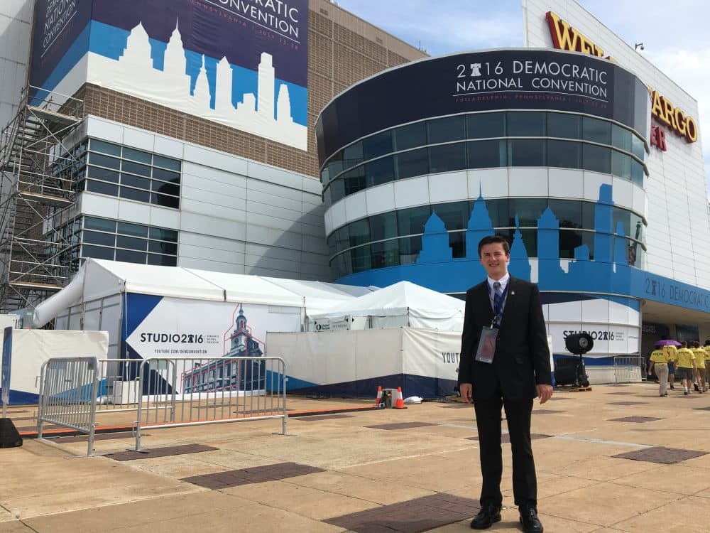 Trevor Doiron, 17 -- one of the youngest delegates at the Democratic National Convention -- stands in front of the Wells Fargo Center entrance, where the convention is being held in Philadelphia. (Shannon Dooling/WBUR)