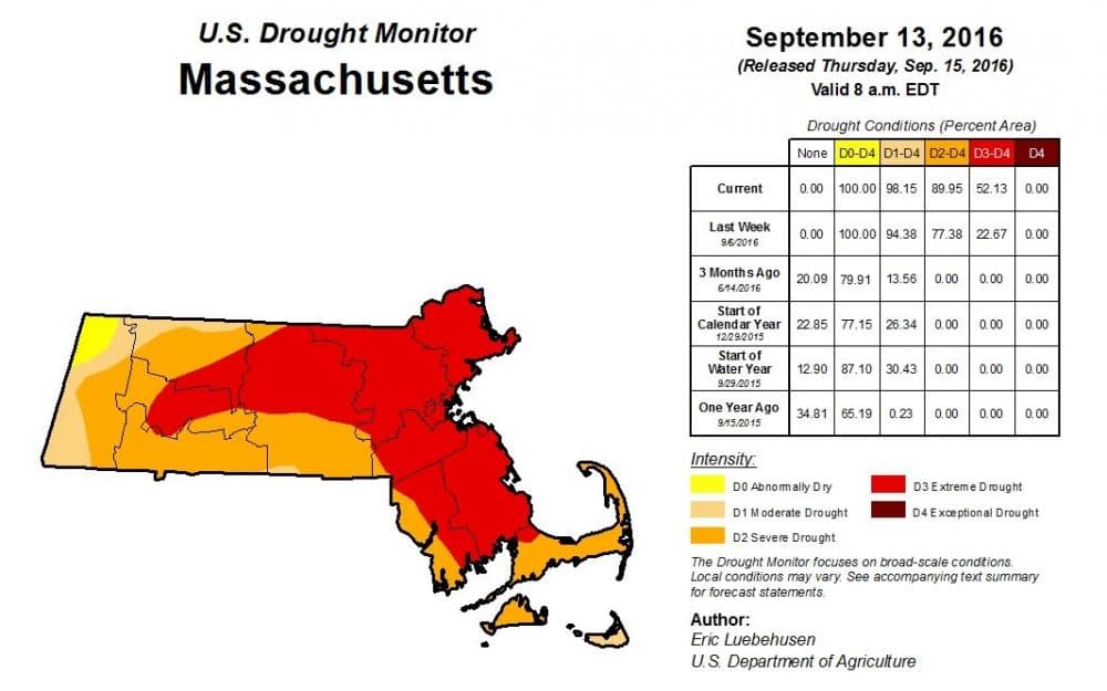 More than 98 percent of the state is in at least "moderate drought," according to the Drought Monitor, and 90 percent is facing at least a "severe drought." September is the sixth-straight month of dry conditions for most of Massachusetts.