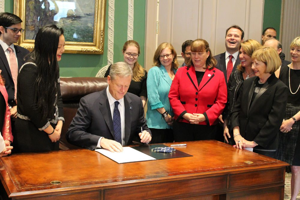 Nguyen and other advocates, Polito, Public Safety Secretary Daniel Bennett, Health and Human Services Secretary Marylou Sudders and a host of lawmakers — including Senate President Stanley Rosenberg, House Judiciary Committee Chairman John Fernandes, House Minority Leader Brad Jones, Senate Minority Leader Bruce Tarr, Rep. Tricia Farley-Bouvier, and Sens. Michael Moore, Eric Lesser and Cynthia Creem — gathered in Baker's office as he signed the bill.