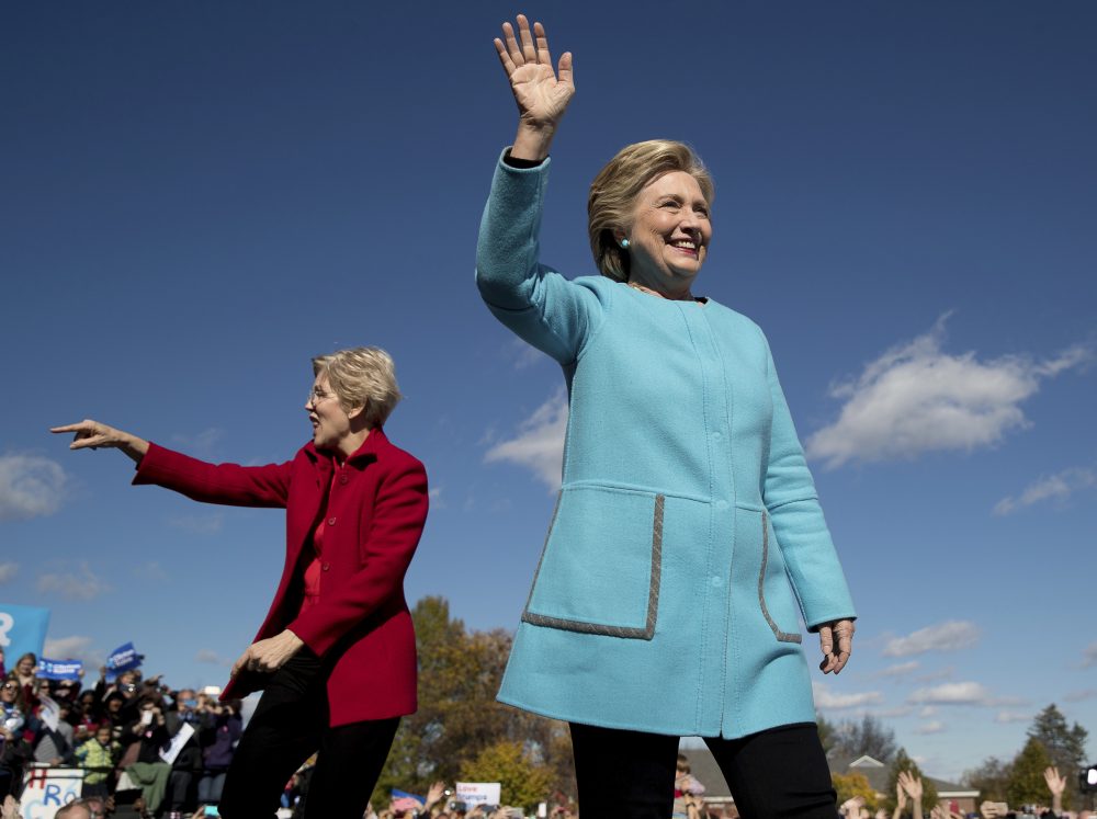 Democratic presidential candidate Hillary Clinton, right, accompanied by Sen. Elizabeth Warren, D-Mass., wave as they arrive at a rally at St. Anselm College in Manchester, N.H. on Monday. (Andrew Harnik/AP)