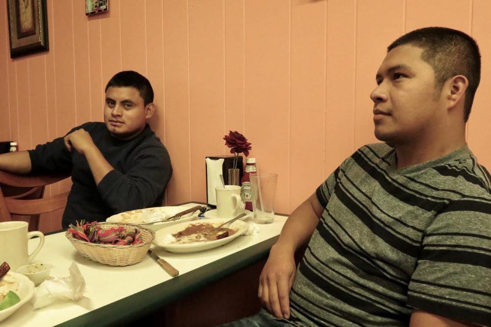 The day Donald Trump delivered his victory speech, New Bedford residents José Ventura, left, and Diego Raymundo talk immigration during their lunch break at a taquería on County Street. Raymundo says immigrants will continue to find a way into the country, even if Trump builds a 40-foot wall. (Simón Rios/WBUR)