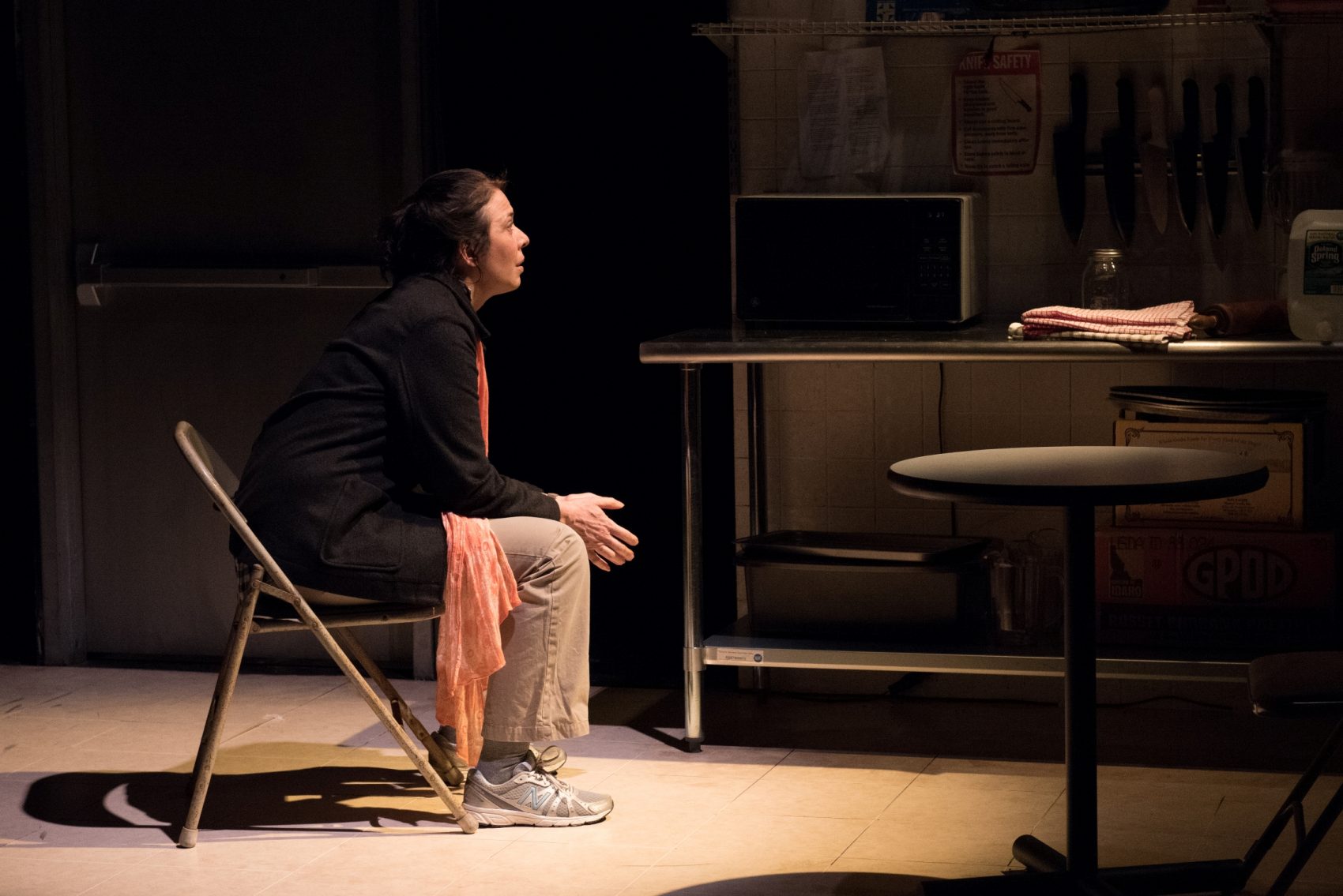 Otherwise, every aspect of the production hits dead-center, and with bruising force. Director Bridget Kathleen O’Leary grounds the play firmly in the sphere of the mundane. The set has a cluttered, banged-up look that fits the setting, with a row of elegantly shaped stained-glass windows floating above the utilitarian work spaces.