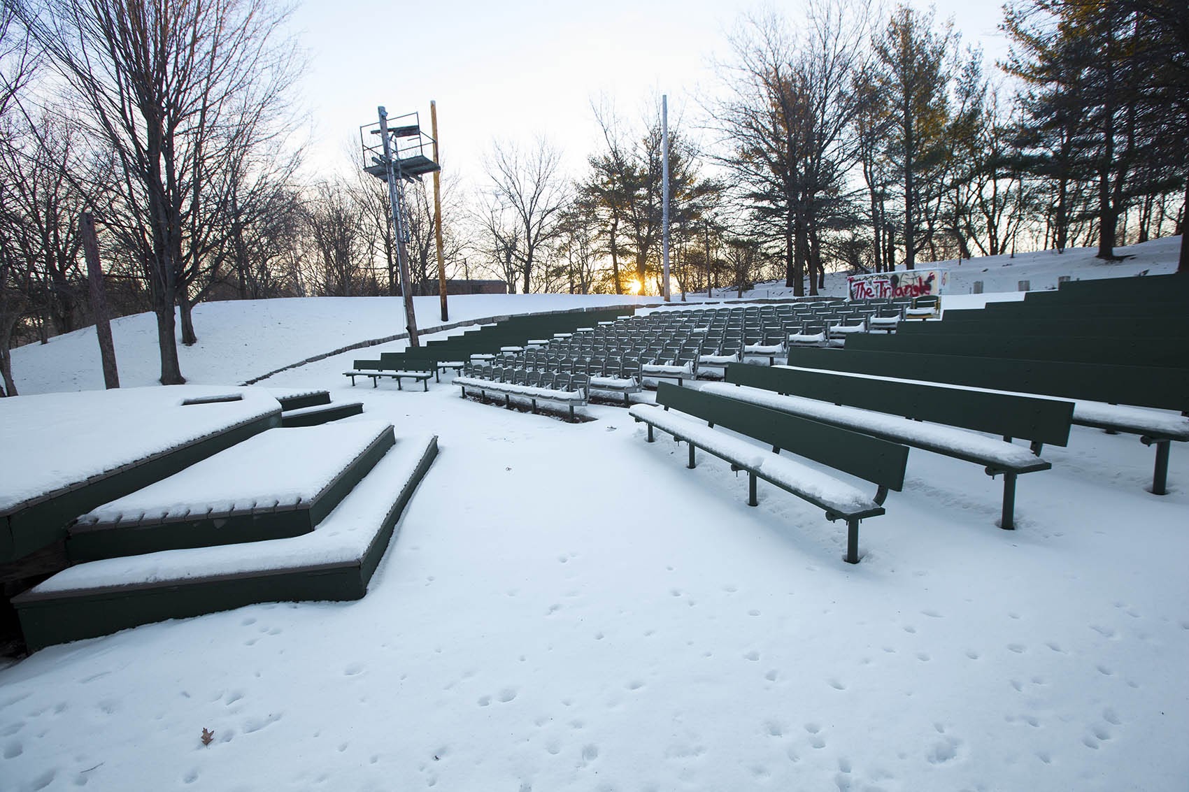 And then, around 2009, things quite literally fell apart. Exposed to the elements, the amphitheater’s lighting structures and wooden stage had begun to rot away, and state funding for maintenance and renovations dried up in the recession. At the same time, the Publick Theatre felt a need for a home more accessible by transit, and a home in which an evening’s receipts wouldn’t be forfeited to a stormy weather forecast. It left Herter Park for the Boston Center for the Arts in the South End, ceding the Herter space to the Orfeo Group, which performed there without lighting in the summer of 2010. After that, the surrounding woods encroached, graffiti marred the stage and rust coated the seat bolts. A 39-year run of performances at the site had ended.