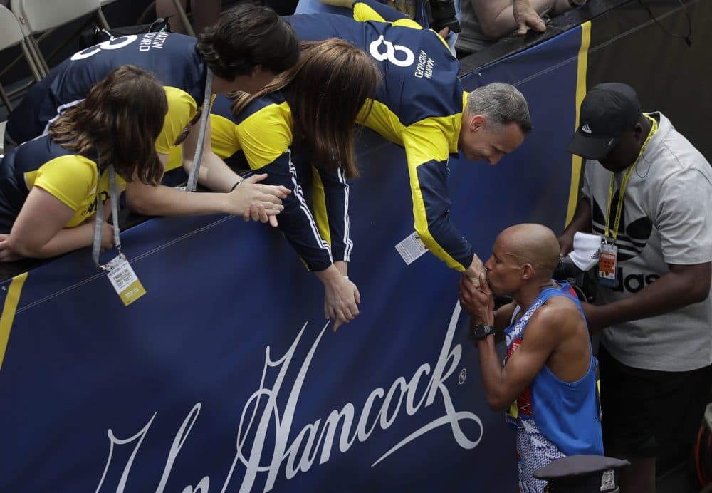 Meb Keflezighi, right, of San Diego, who won the 2014 Boston Marathon, greets the family of 2013 Boston Marathon bombing victim Martin Richard after he finished the 121st Boston Marathon on Monday in Boston. (Charles Krupa/AP)