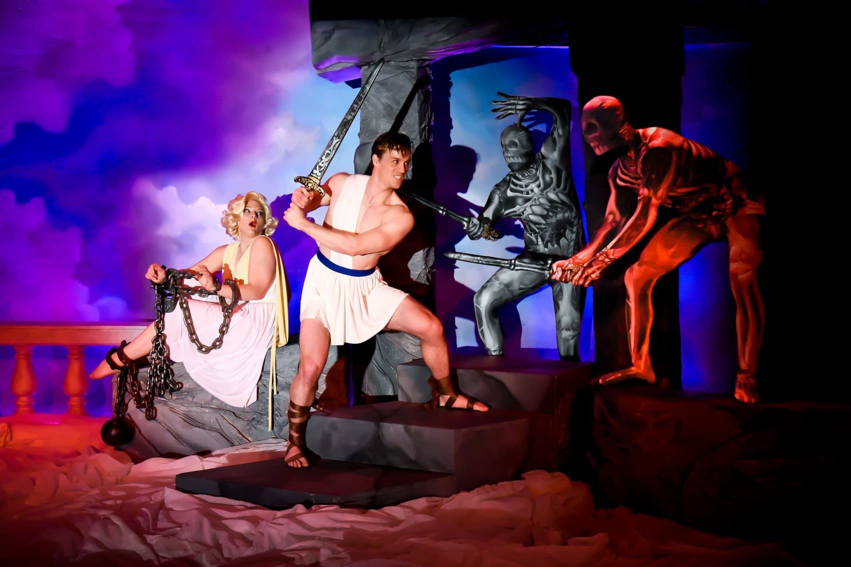 Among the regulars, Landry is a fetching, fuming strawberry-blonde Venus (except when the goddess is being represented by a decapitated statue, its cardboard mouth of stone flinging curses). He also does a quick turn as Elvis, rocking in a pompadour and big-ass, jeweled belt that would be as perfect on a jumpsuit as a chiton. Larry Coen, who also directs, is a booming, bolt-bungling Zeus. And Tim Lawton turns his impressive tonsils to an over-ambitious Hades who milks a pretty fair Trump impersonation.