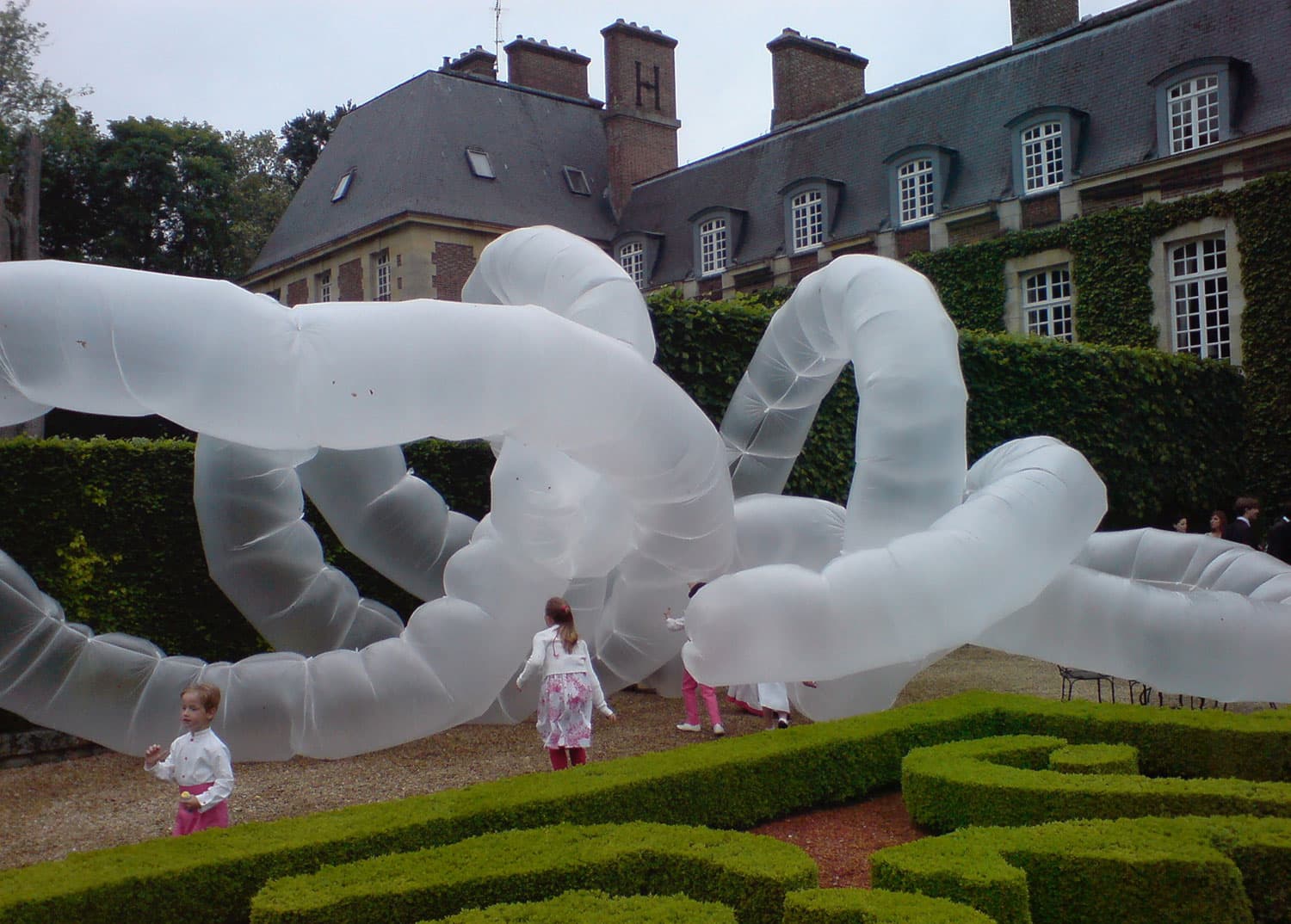 Shih Chieh Huang describes his curious inflatable art as “intestinal shapes or worm-like shapes.” He constructs the plastic tube balloons from a skin of common painter’s plastic drop cloths that he knots together and then inflates with stacks of household box fans to stretch as much as 400 feet.
