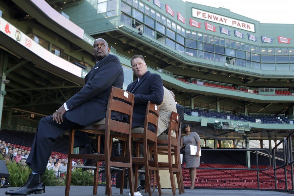 Cedric Maxwell, former Boston Celtics player and Bob Sweeney, executive director of the Boston Bruins Foundation, look toward a video screen during a panel discussion held to introduce an initiative called "Take The Lead" Thursday at Fenway Park. (Steven Senne/AP)