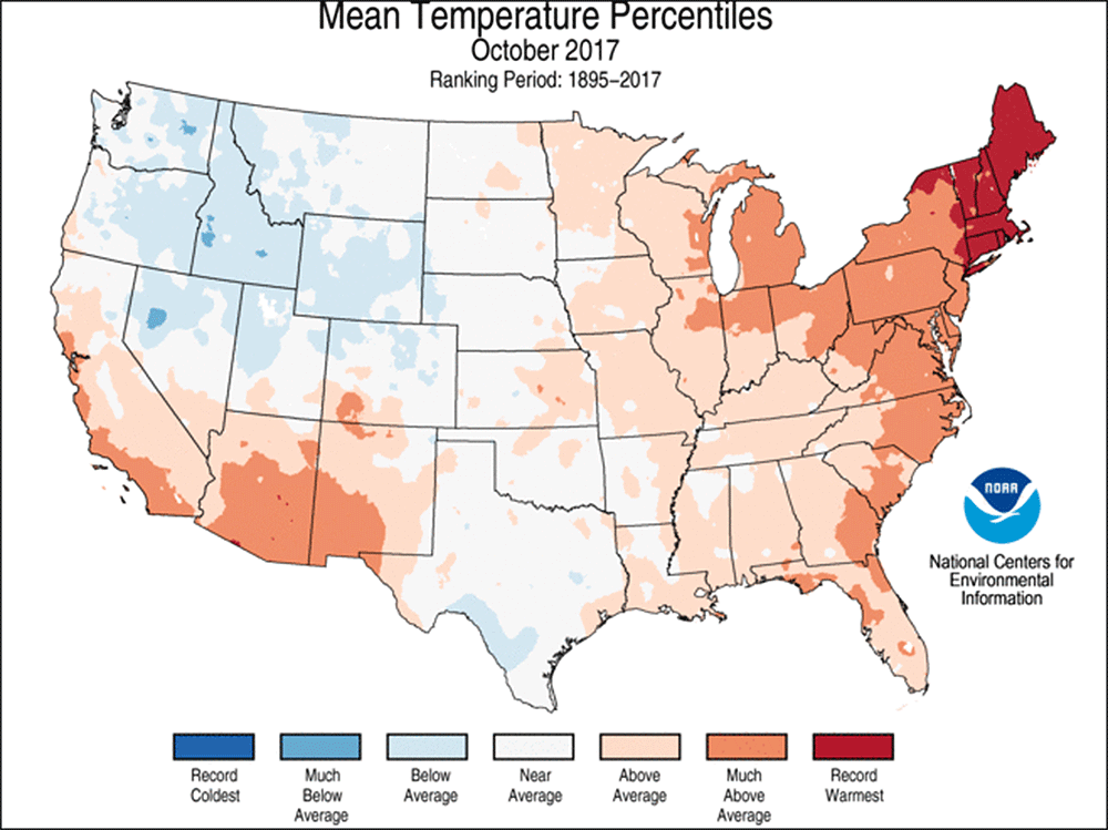 Nationally, last month was the third-warmest October on record, at 1.6 degrees above the 20th century average.