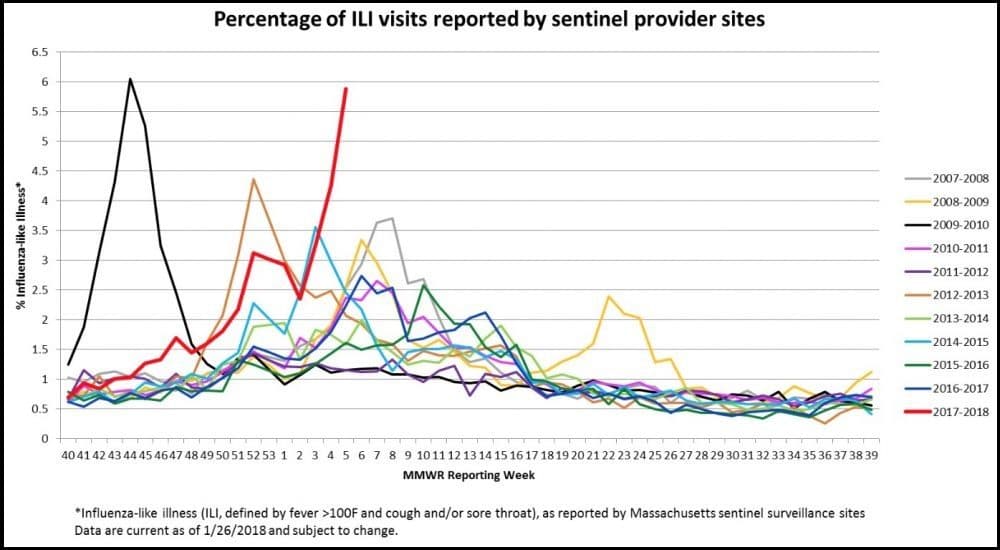 Chart showing the percentage of flu-like illnesses reported at Massachusetts health sites. (Courtesy Mass. Department of Health)