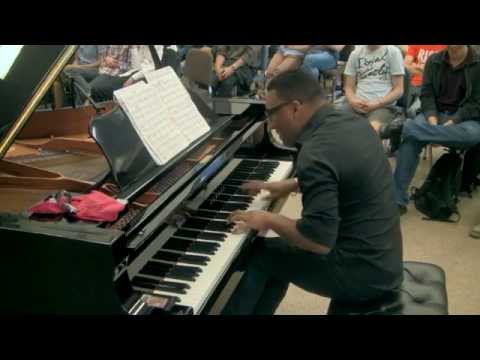 When they play, the percussive nature of the piano is illuminated. The 12-bar blues form is so malleable and foundational that jazz musicians often play the stuff that is most fundamentally them. Playing the blues together, Valdés and Rubalcaba play incredibly dexterous lines and interesting harmonies, but they are most notably percussive. Even the swift descending lines Rubalcaba plays in his solo are segmented into distinct, accented rhythmic patterns. Valdés strikes the piano as he might a drum, lifting his hands high and impacting the keys in ringing bursts.