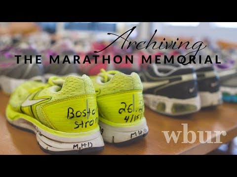 Every shoe and race bib from the memorial in 2013 was painstakingly collected, cataloged and preserved by Boston archivists. In the city warehouse, there are a few hundred items, from posters to flags, plus 2,000 cards and letters that were mailed to then-Mayor Tom Menino at City Hall. Storage company Iron Mountain donated space to Boston and holds an additional 286 boxes, including 135 boxes of sneakers and 75 boxes of stuffed animals.