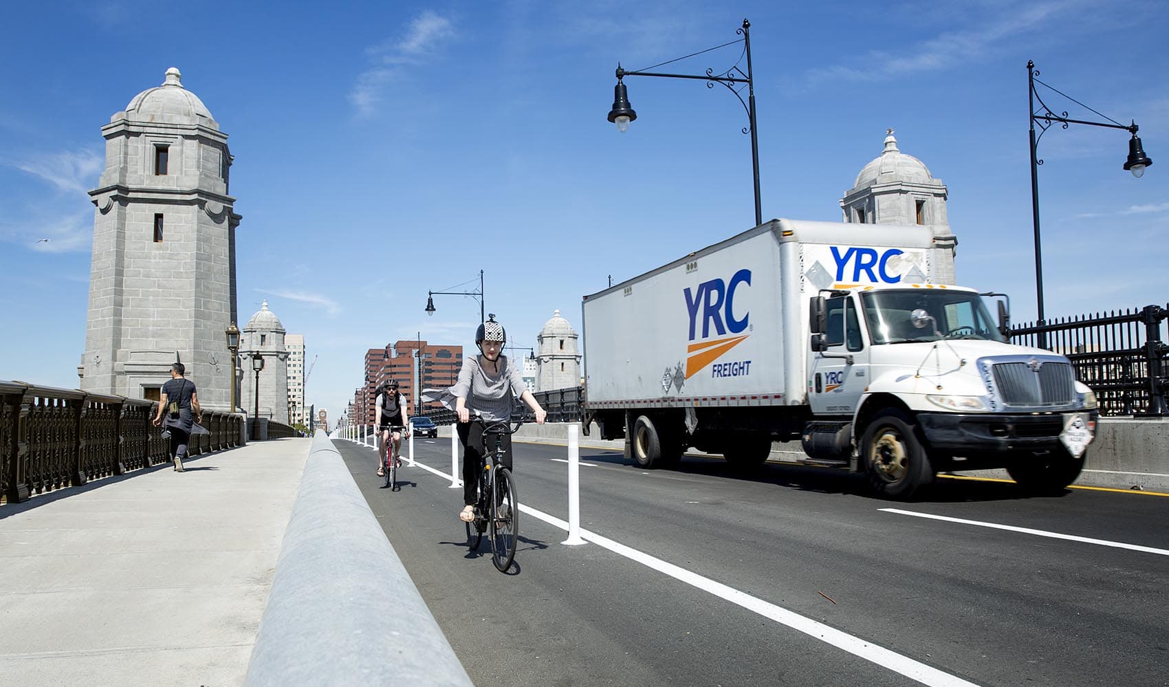 The bridge now features one fewer car lane in the outbound direction, with wider sidewalks and posts protecting bike lanes. The MBTA Red Line also has new track.