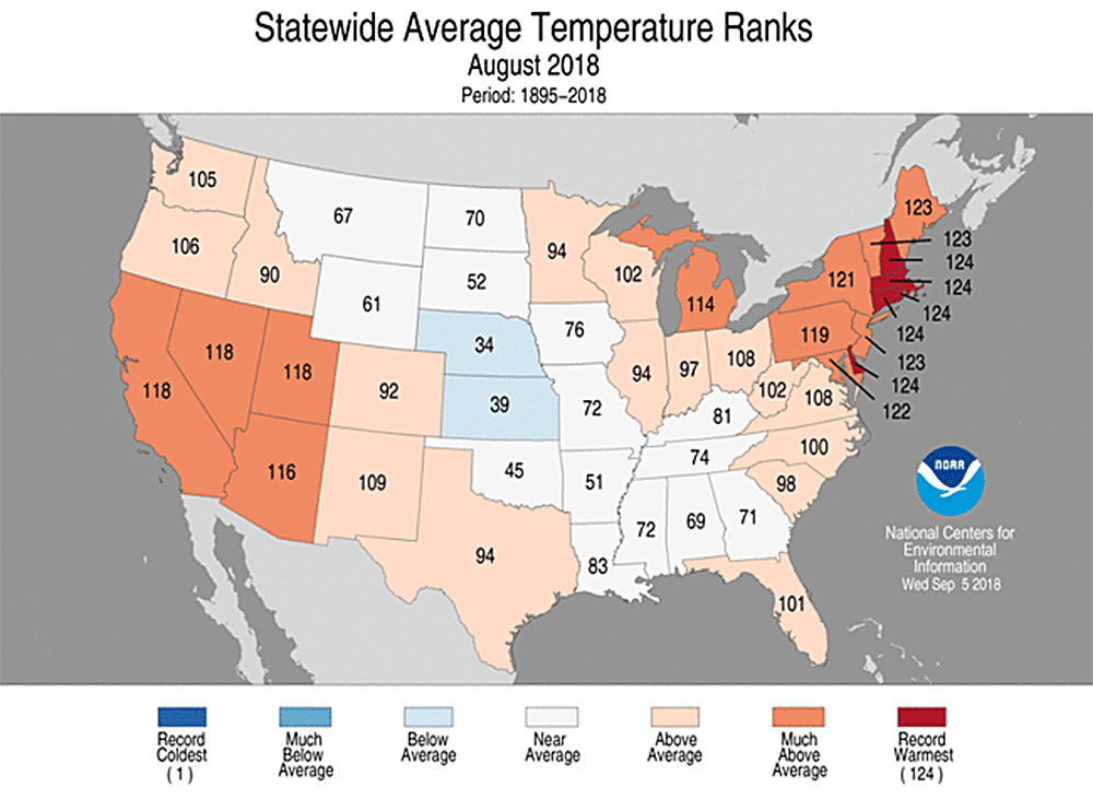 Three other New England states — Connecticut, New Hampshire and Rhode Island — set August records. For the other two New England states, Vermont and Maine, it was the second-warmest August on record.