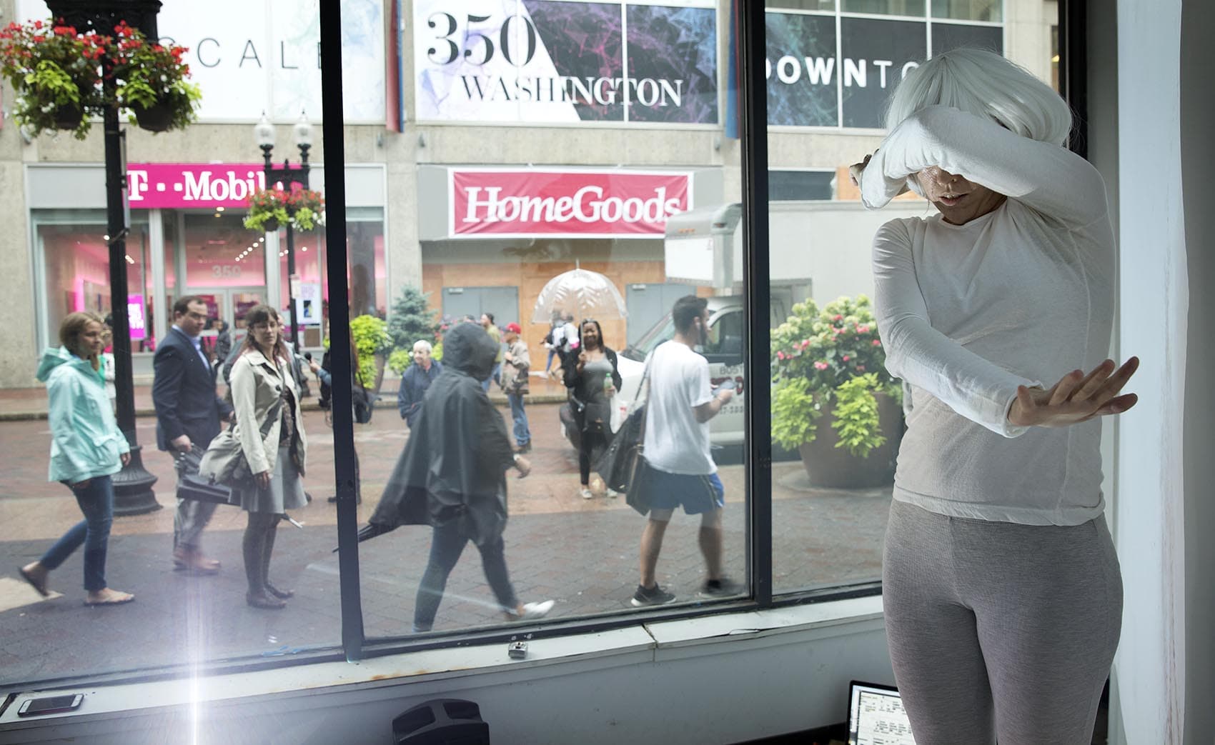 In A Boston Storefront, This Living, Breathing Fashion Mannequin Asks 'Are You Buying?'