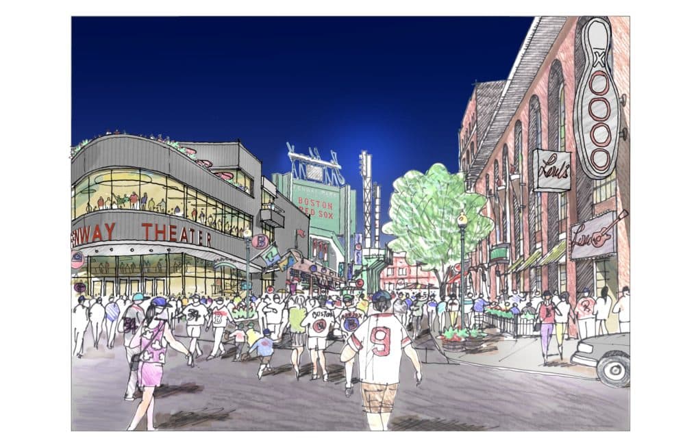 Along with the announcement, Fenway Sports Group released a preliminary design concept. The sketch depicts a three-story complex with a roof deck and front doors facing the crowds streaming down Landsdowne toward the baseball park.