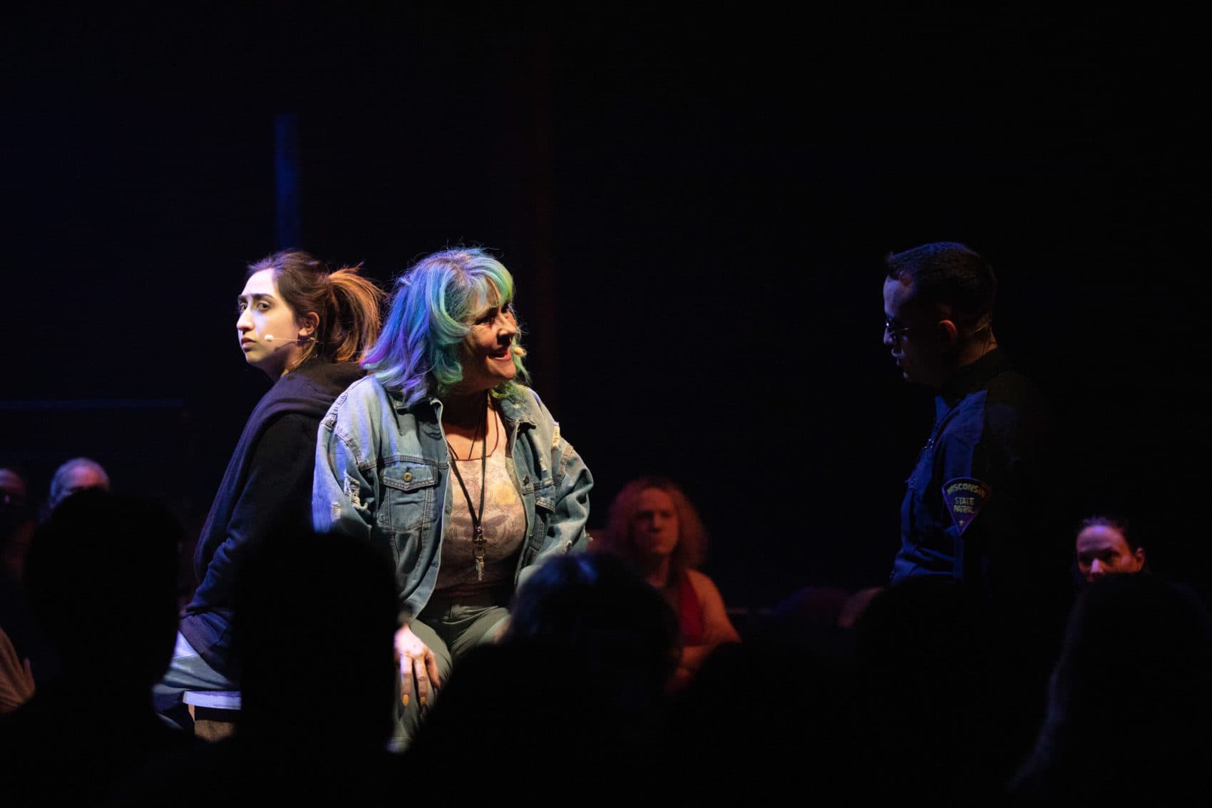 In director Summer L. Williams’ production, the chorus marches around in circles, like Up with People without the costumes and the choreography. At Oberon, most of the action unfolds on a small, circular playing space surrounded by café seating. The transitions between scenes are creaky, and Erik D. Diaz’ set is little more than a few road signs and two wooden wheels you might see by the side of a highway. The staging is all over the place and doesn’t show a clear trajectory in time and place.