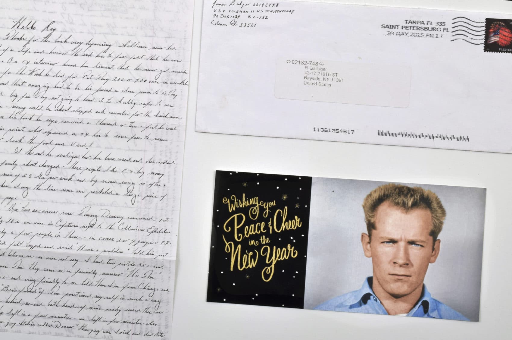With another letter, Bulger included a holiday card that he apparently made in 2015 with the message in gold script: “Wishing you peace & cheer in the New Year.” Next to the cheery greeting is Bulger’s Alcatraz mugshot, his eyes piercing blue eyes narrowed and brows furrowed.