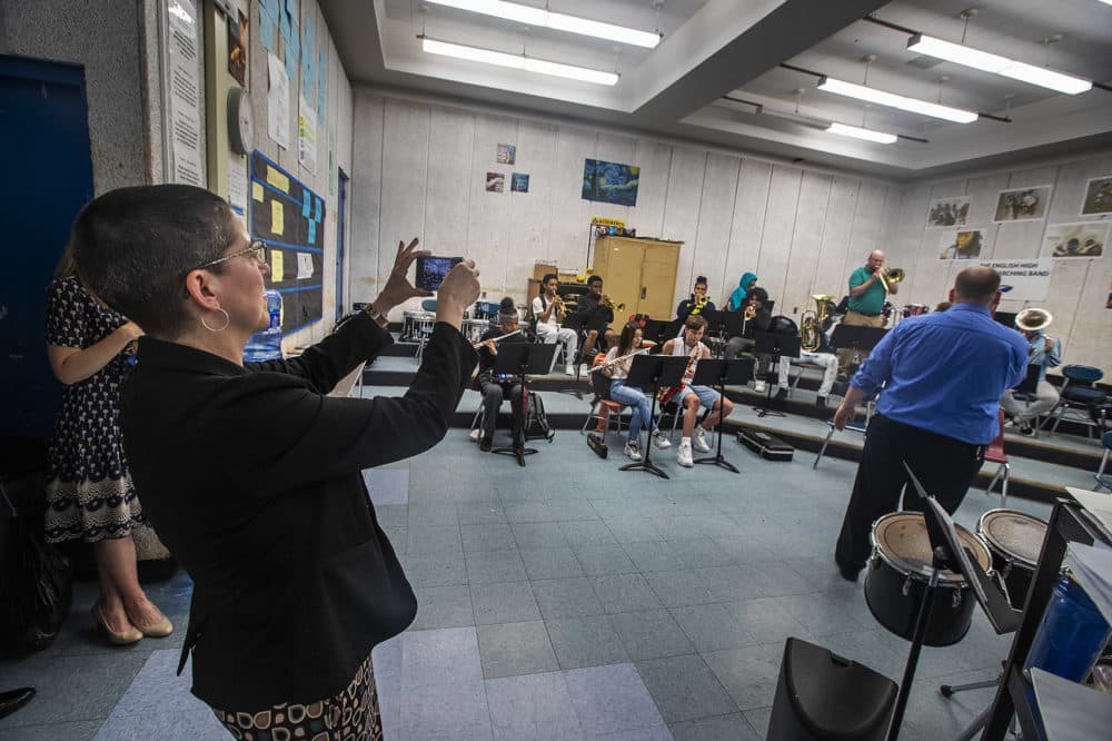 Perille asked questions and offered encouragement in a meeting with English's principal, Caitlin Murphy, who spoke to promising results in the school's test scores — and a few ongoing struggles with chronic absenteeism and low graduation rates. Afterward, she checked in on English's marching band — the only one in the city's schools. Then she got back on the road.