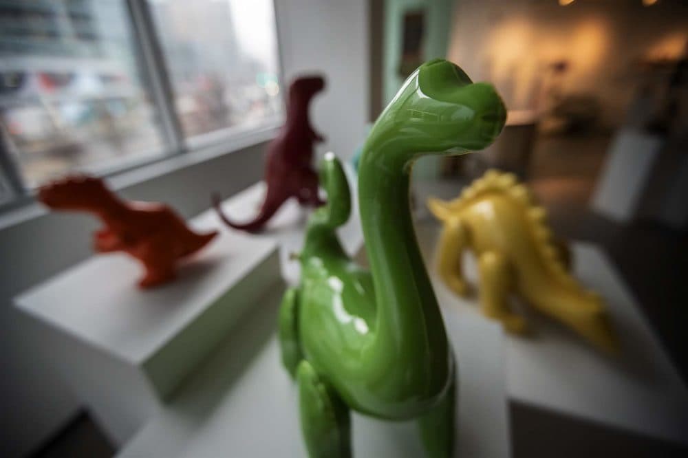 At first glance, the big airy gallery at the Society of Arts and Crafts in Boston's Seaport looks a bit like a scrapyard menagerie: a herd of ceramic dinosaurs, robots made out of scavenged metal, an inflatable poodle with its puffy head cocked to one side.