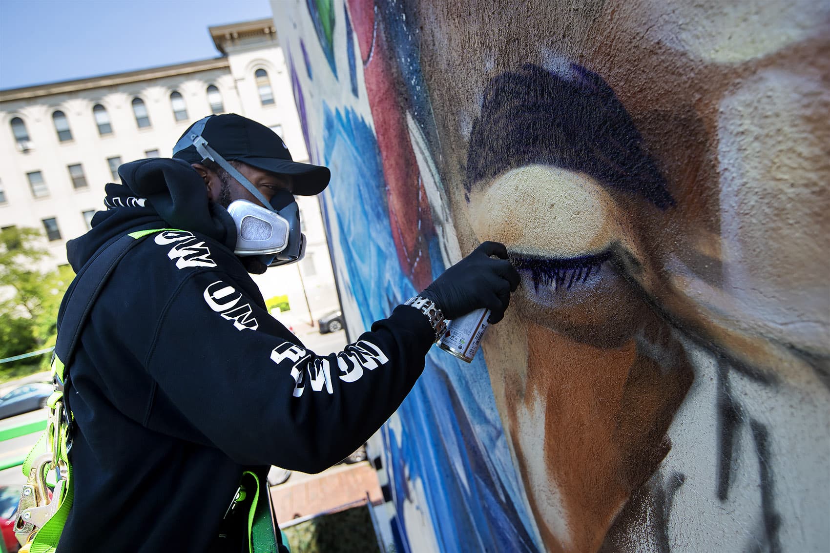 June 5 | Artist Problak Gibbs spray paints in eyebrows on his mural, "Breathe Life 3" on the side of 808 Tremont St., a three-story building in Roxbury. “Breathe Life 3” is the third incarnation in Gibbs’ “Breathe Life” series and, like his other works, highlights black children.