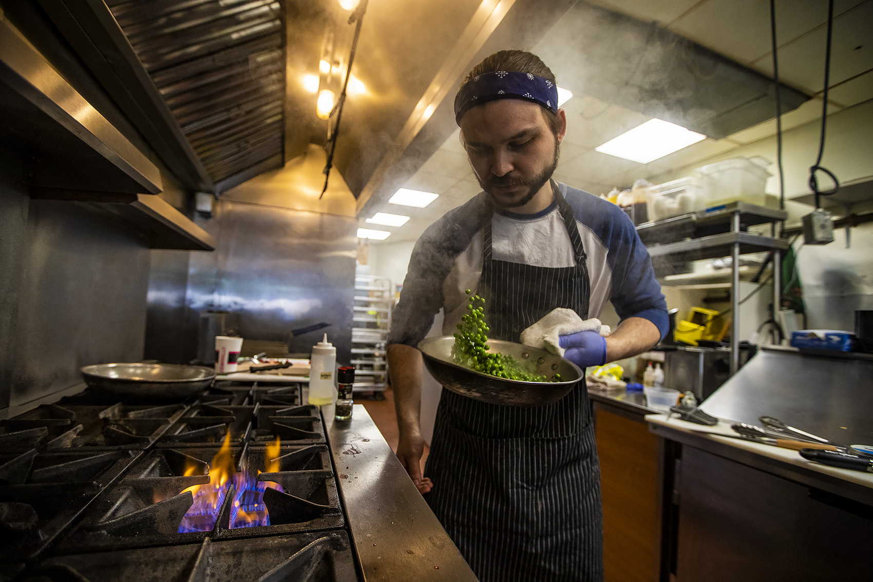 June 6 | Chef David Ferragamo, owner of Euphoric Food, tosses a pan of sautéed peas in a pan. As some Massachusetts residents consider savory options around food and marijuana, his company puts on marijuana dinner parties mostly in the comfort of peoples' homes.