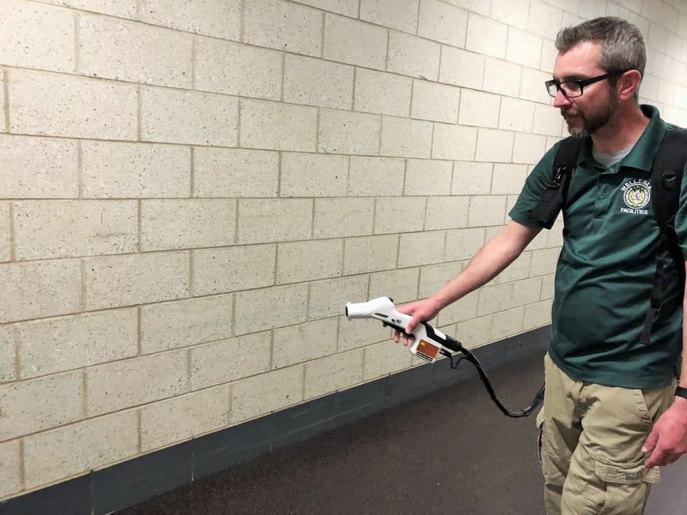 The town of Wellesley bought one for every public building at the start of flu season and now is using them to guard against the coronavirus. With a misting gun attached by a hose to a tank on his back, custodian Tony Vassiliadis demonstrated by disinfecting a drinking fountain at Wellesley High School.
