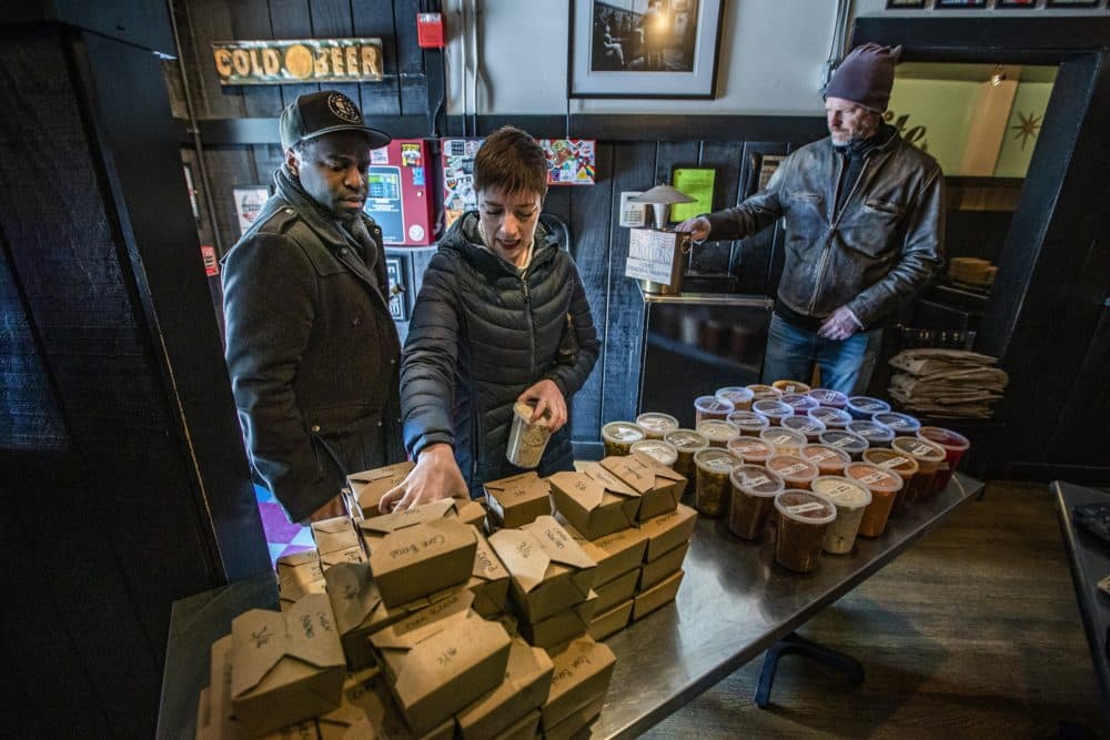 That includes the bar's regular customers, like Kate Heffernan and Omar Robinson, Somerville residents who came to load up on food and donate to the staff.