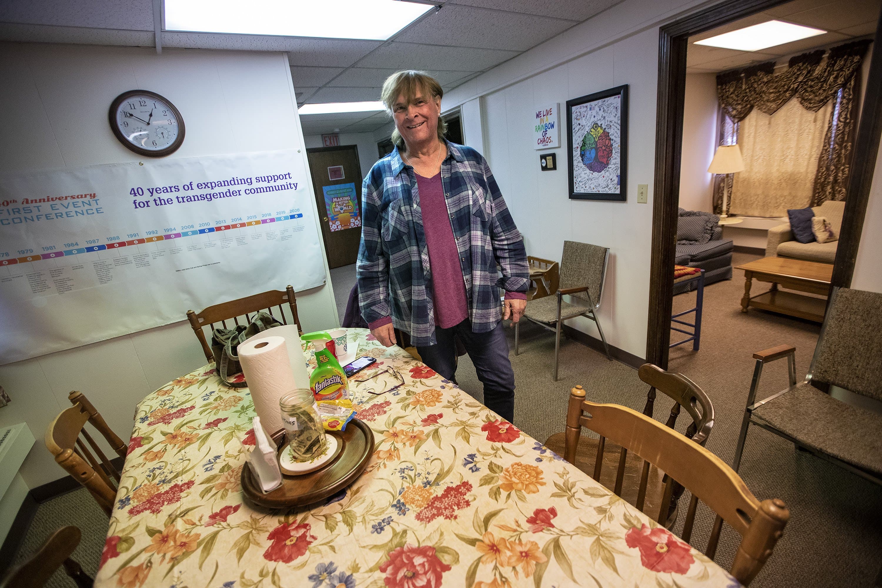 The rugged exterior of the building, which TCNE calls its clubhouse, belies the homey interior. There's a dining table and drapes with a floral pattern. Belmore says when people are here, there's chatter about politics or the weather or what it's like being trans.