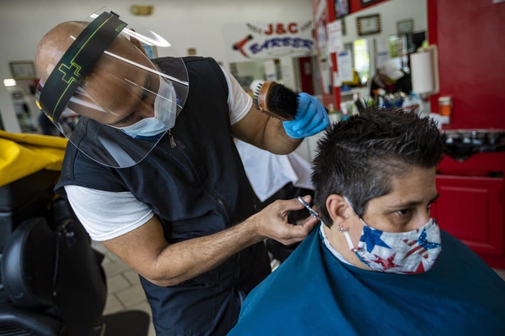 Down the street, J&C Barber Shop opened on Monday for business. Latin music spilled out of its open door onto Blue Hill Avenue, and two men were wearing face masks inside as they got haircuts. Leuris Luna is one of the barbers there. On opening day, he was wearing gloves, a mask and a face shield.