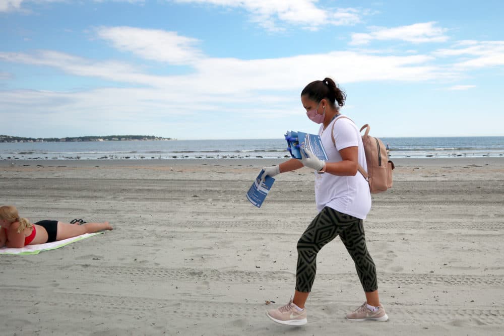 Cristiane Alves hits the beach on Labor Day weekend as part of an effort to spread awareness about COVID-19 prevention in Lynn, which continues to see a higher-than-average number of cases. (Adrian Ma/WBUR)