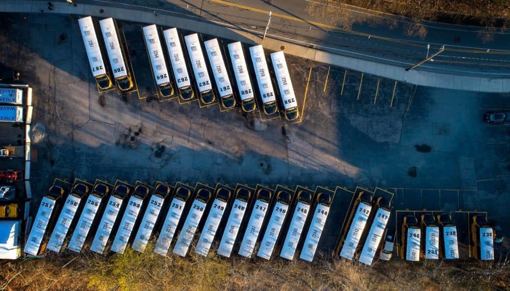 School buses parked on Pleasant Street in Belmont, Mass. on what would have been a school day in April 2020. (Robin Lubbock/WBUR)