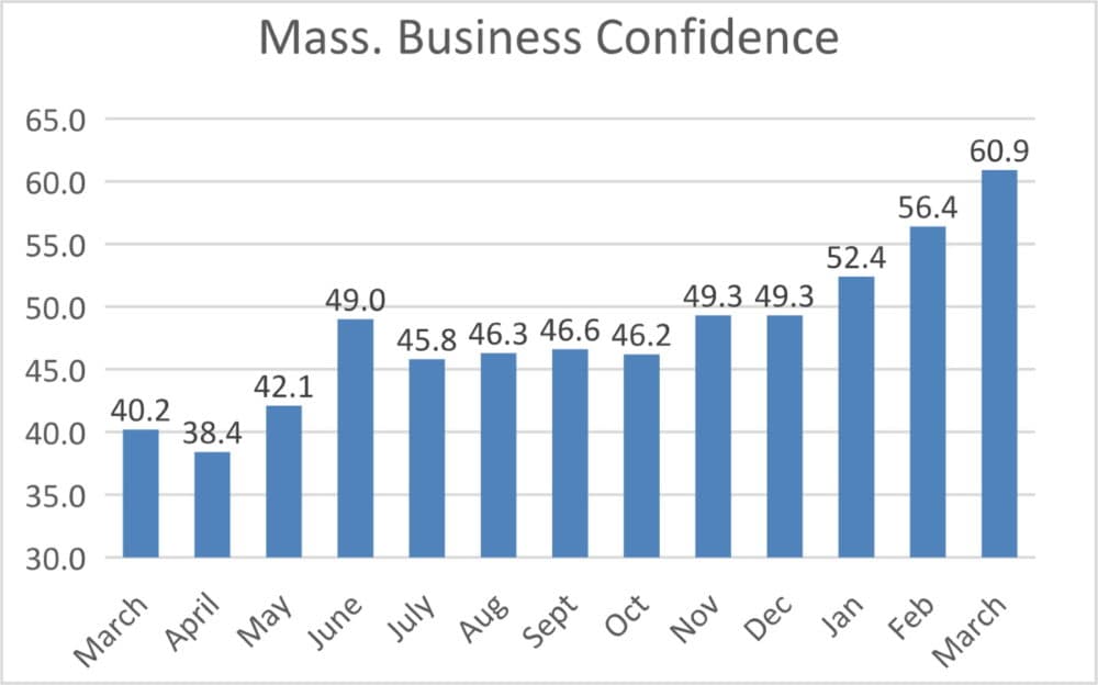 Business confidence in Massachusetts surged to an outright enthusiastic level in March, buoyed by COVID-19 vaccination progress and the final passage of a $1.9 trillion federal spending law.