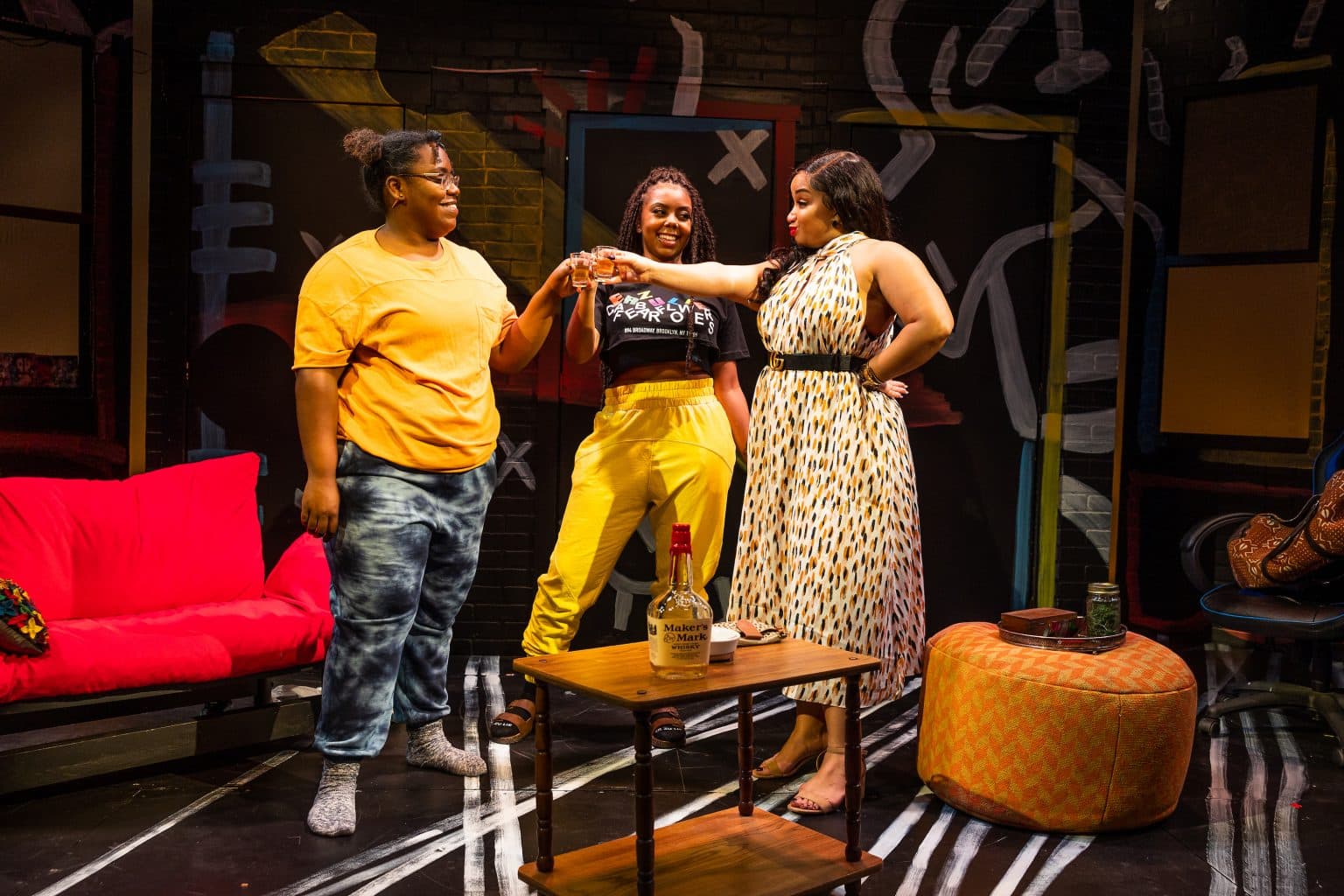 Upon entering the theater, it’s evident that the show centers around lively characters. Set designer Jenna McFarland Lord’s apropos scene for the New York-set narrative features black walls painted with broad strokes of white, red, yellow and green geometric shapes and lines inspired by the work of artist Maxime Manga.