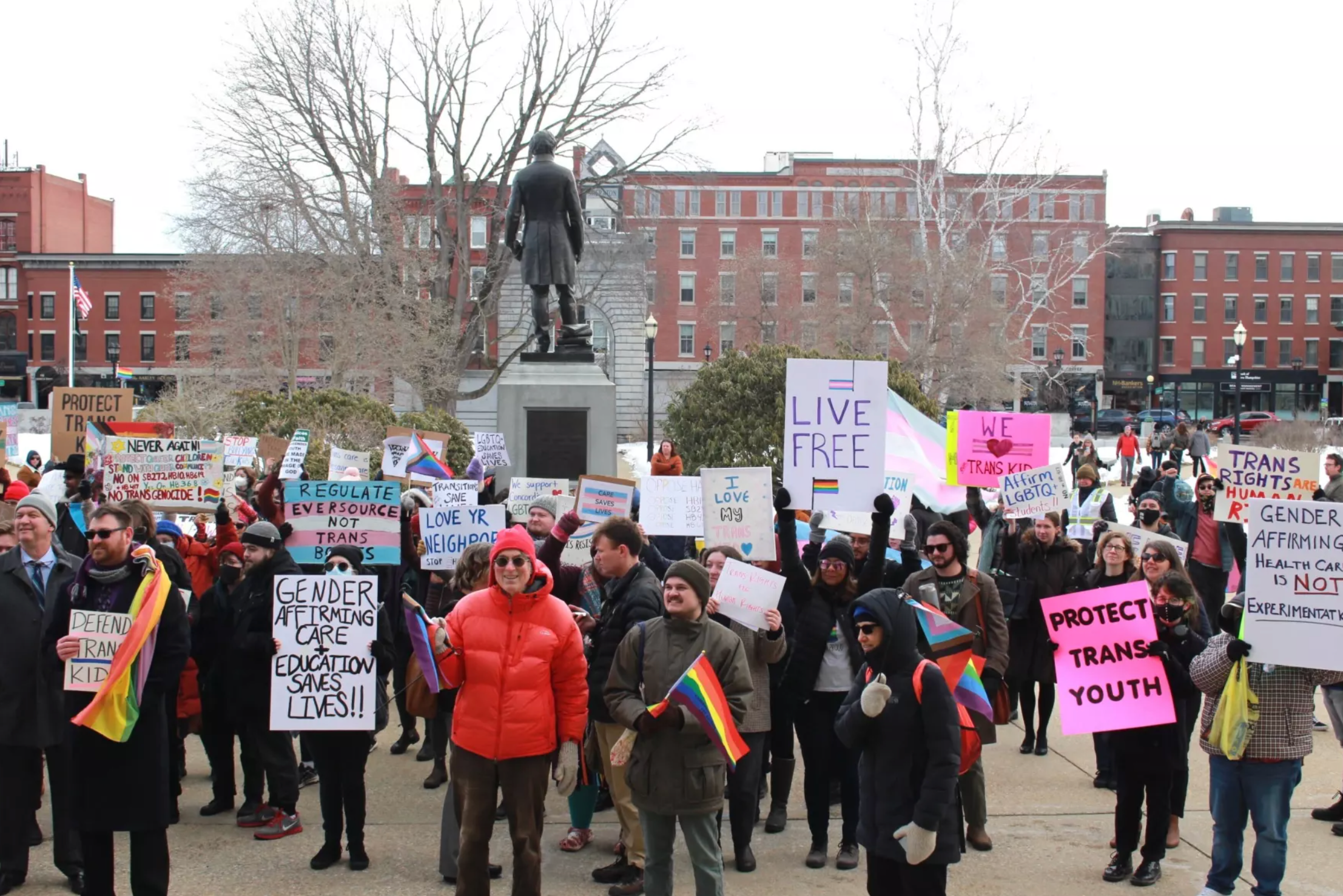 Large crowds showed up at the New Hampshire State House Tuesday to push back on a slate of Republican-sponsored bills that would curtail the rights of LGBTQ+ youth.