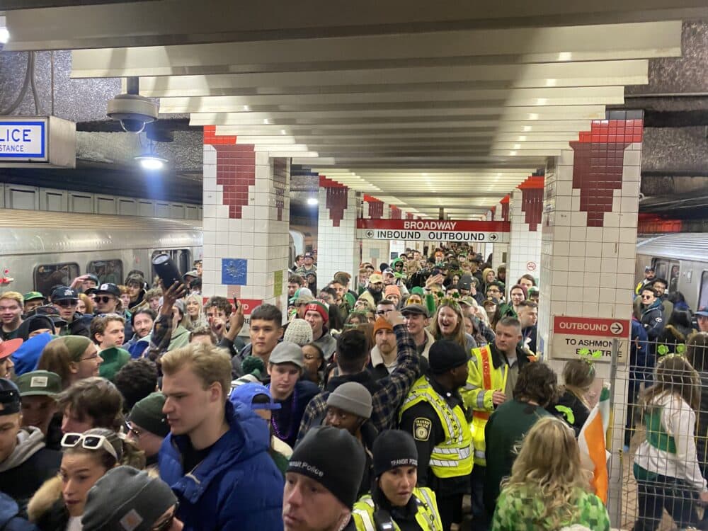 Red Line trains packed with people crawled into Broadway station Sunday morning. The passengers, who were wearing green leprechaun hats and wielding cases of beer, could barely get out onto the platform and up the stairs.