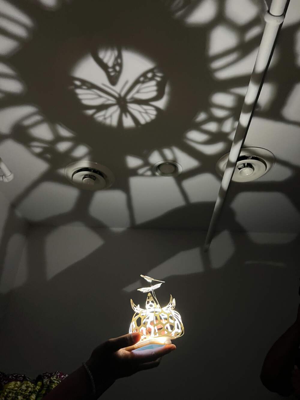 Then, in a small dark room the mothers shined a light through the center of each lantern. On the ceiling, the shadows looked like butterflies.