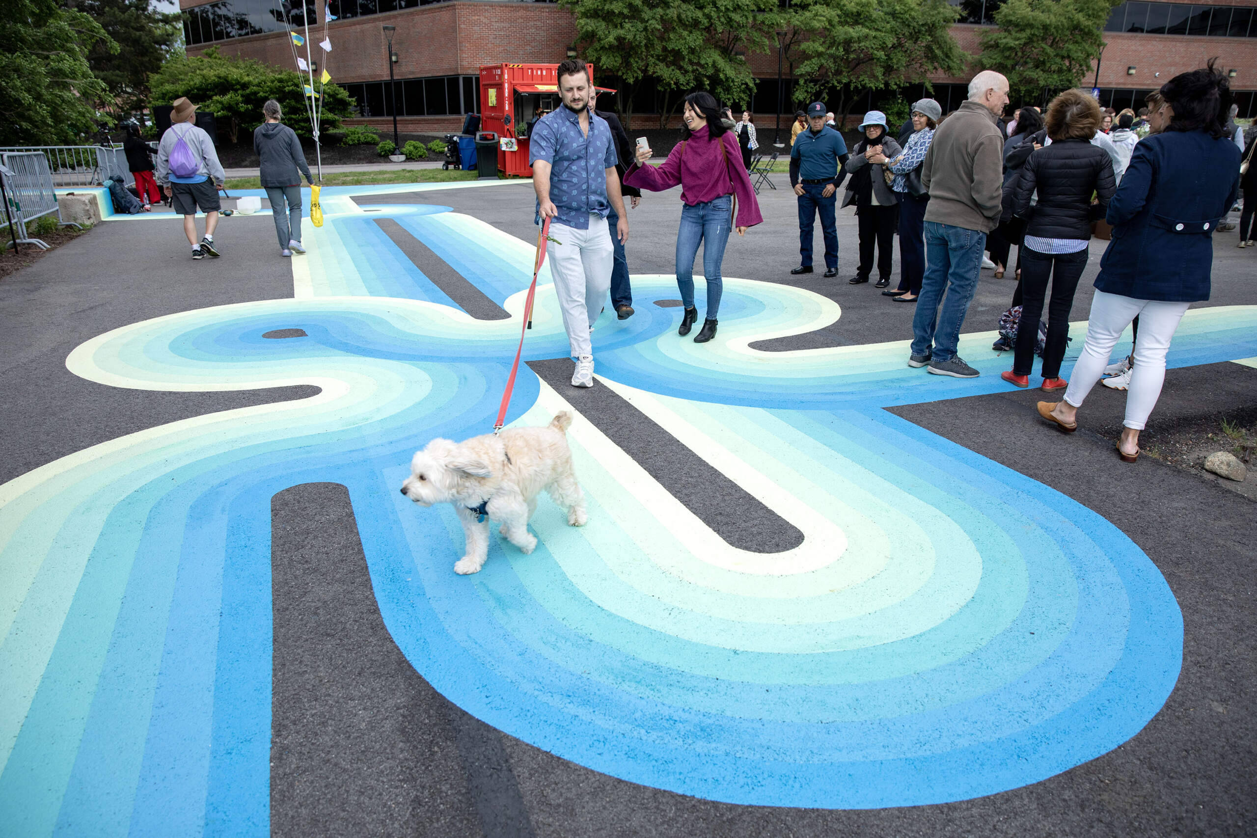 Visitors walk on and around the gradated, blue lines that snake along the asphalt, colors that were inspired by Boston Harbor. Others can take photos in an arch made by the lines that jump up onto the side of a shed onsite. Grullón’s piece is having its intended impact. “So the whole installation is meant to be interactive because it kind of leads the viewer to walk around it and also be part of it,” she notes. “My work is very interactive because you can put yourself into it.” There is an additional hope that by following “Knotical Waves,” visitors will bump into each other and perhaps conversations will happen if they do.