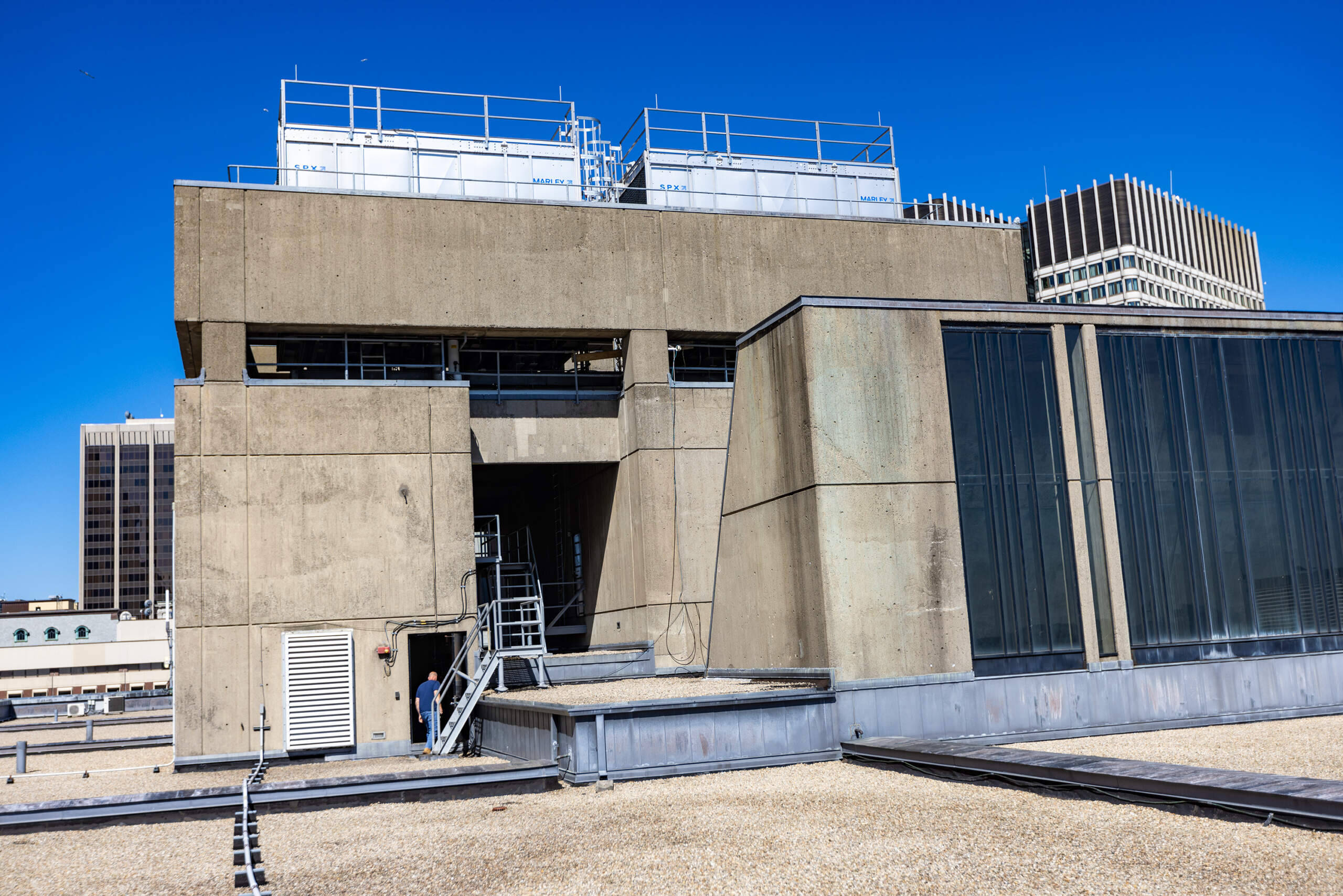 Atop the massive concrete block that is Boston City Hall stands a pair of giant metal cooling towers. These units regulate the air temperature for roughly 2,000 people working in the nine stories below.