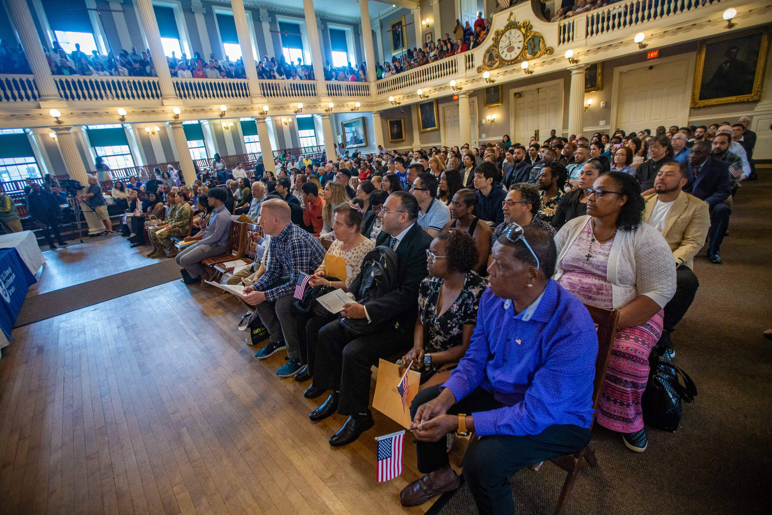Massachusetts became home to new U.S. citizens on Monday. The right hands of 263 people rose as they swore the Oath of Allegiance during a ceremony at Faneuil Hall.