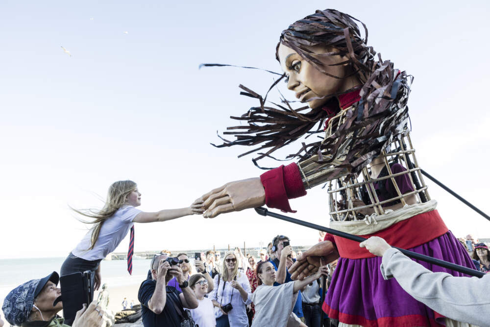 While she’s made of lightweight materials, such as cane and carbon-fiber, and requires three puppeteers at one time to operate, she’s also a symbol of refugee displaced populations now widely recognized across the world. Her name is Little Amal, “hope” in Arabic. She’s designed by Handspring Puppet Company of South Africa, the company responsible for the lauded main character in “War Horse.” Though she’s as expressive as the company’s other theatrical creations, her performance has played out across a much wider stage. Amal’s first performance took place in 2021. “One side of the stage was the Syrian border with Turkey. The other side of the stage was Manchester in the UK,” said David Lan, co-founder and producer of The Walk Productions.