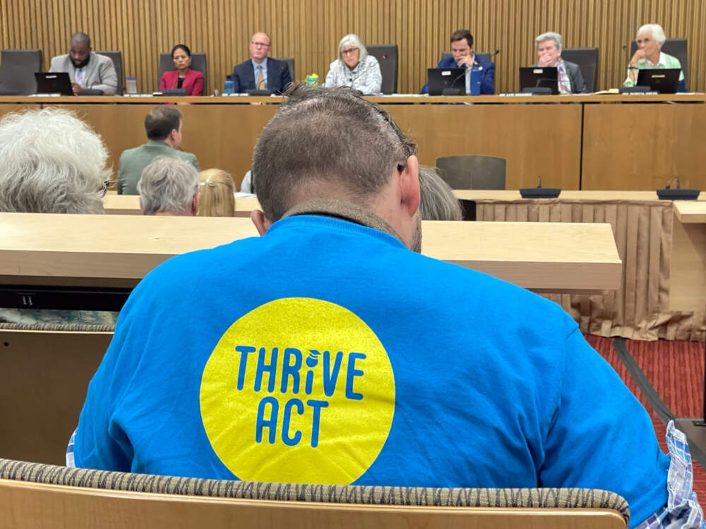 The joint committee on education began its hearing later than usual —at 2 p.m. — to better accommodate working educators and students. It attracted a crowd of dozens to the State House’s Gardner Auditorium, most wearing blue T-shirts in support of the Thrive Act.