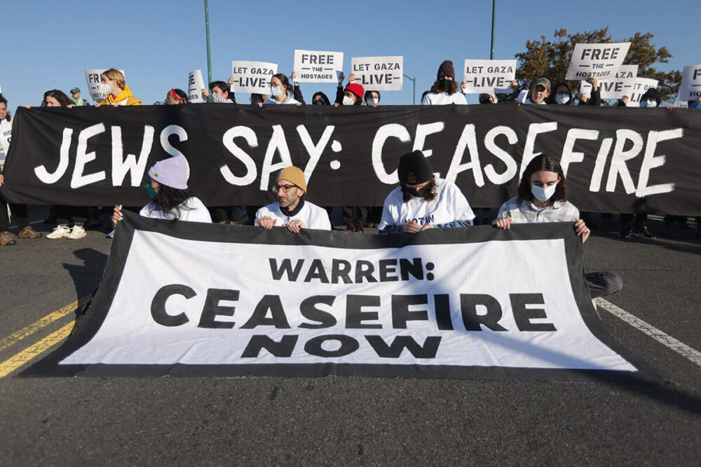Members of the group IfNotNow sat on the road, unfurled a banner and held signs as they blocked rush-hour traffic on the bridge that connects Boston and Cambridge to demand U.S. Sen. Elizabeth Warren (D-Mass.) call for a cease-fire in the war between Israel and Hamas. The group IfNotNow consists of Jews in America calling for an end to U.S. financial aid for what it calls "Israel's apartheid system."