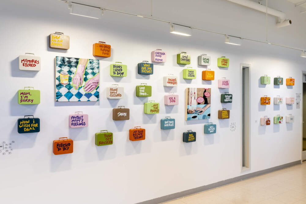 At the Pao Arts Center, two walls are covered in brightly painted lunchboxes with quotes like "What are you eating?" or "skeptical smell." It’s the work of New England-raised Amie Bantz. The Asian-American artist and art director collected these quotes, along with dozens of others, from family, friends, online sources and a workshop hosted at the Pao Arts Center.
