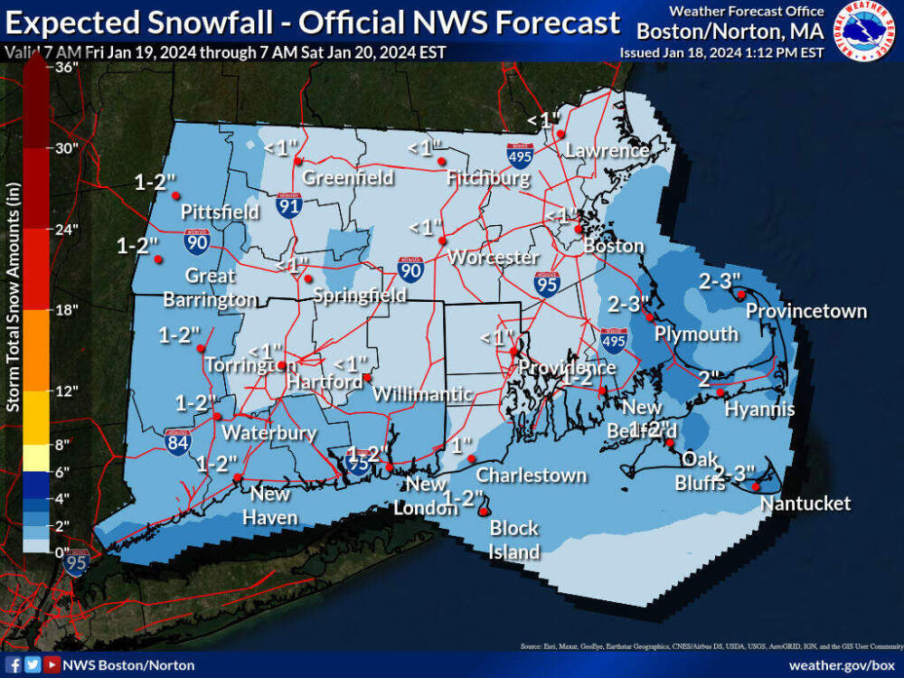 Since we'll be on the fringe of the storm, don't expect much in terms of accumulation. The snow will start as some flurries Friday morning, turn steadier and more widespread during the middle to late morning, and linger until evening, around or shortly after suppertime. When all is said and done, very little if any snow will likely have fallen in central and northern New England, but the southern half of New England should pick up amounts ranging from a coating to 2 inches, though an isolated amounts of 3 or 4 inches are possible from southern Plymouth County to around the Cape Cod Canal. This will be enough to bring out road treatments for some and plows in spots south of Boston.