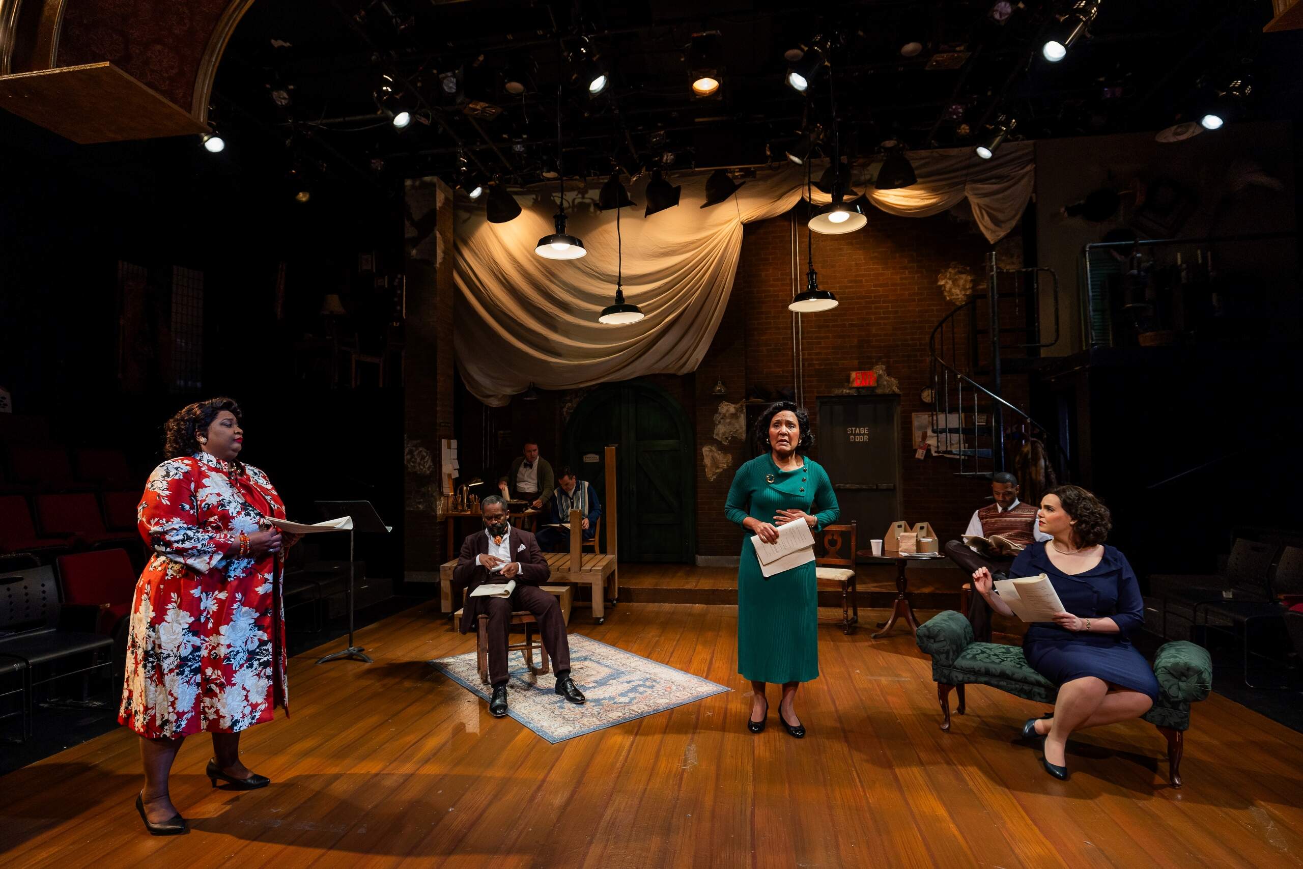 The play’s subject matter is meaty for sure, but humor helps bring some levity, so the timbre doesn’t veer too far into darkness and dwell there. The fantastically clad cast — courtesy of Rachel Padula-Shufelt (including the character Sheldon’s suits and a memorable bright orange dress and flowered overcoat donned by the character Millie) — delivers stellar performances on a well-appointed set designed by Shelley Barish. But some of the best moments are between Jean-Baptiste’s Wiletta and Henry (Robert Walsh), who is dealing with memory loss. Henry works in the theater where the cast is rehearsing and is a fan of Wiletta’s work. He is a kind soul who is belittled by the director for his minor mistakes. Whenever possible, he comforts and reassures Wiletta in their private chats.