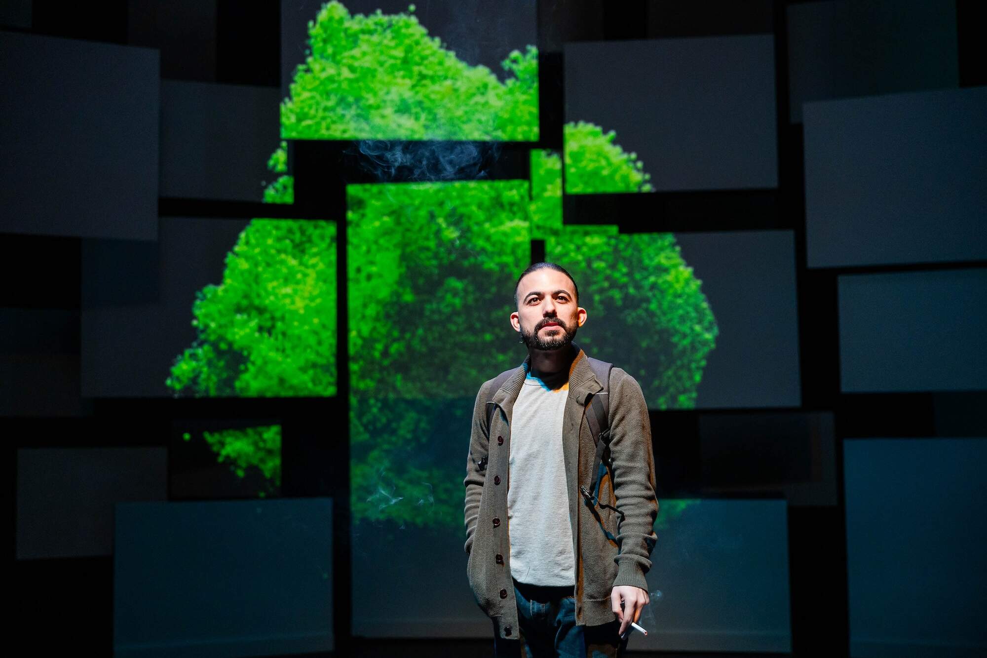 It's a solid production under Gabriel Vega Weissman’s direction. Multiple suspended screens are aglow with a green churning image when Arnold speaks. The actor voicing Arnold is offstage. The clever (and on-genre) use of video and projections by SeifAllah Salotto-Cristobal and white screen-shaped squares that hide furniture and other props (courtesy of scenic designer Janie E. Howland and props person Julia Wonkka) bring the audience through multiple settings.