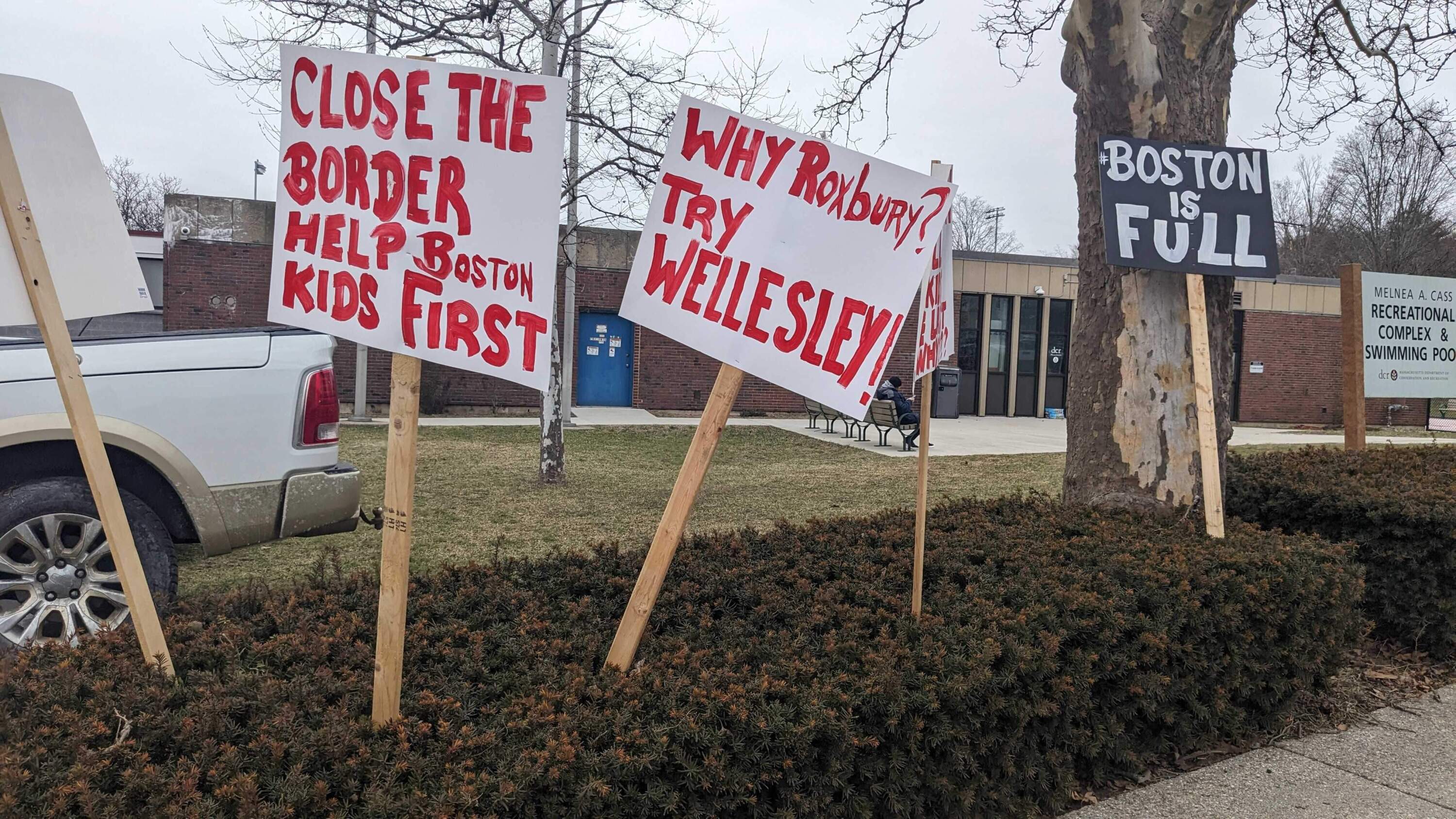 On the day city and state officials toured the Cass complex, as immigrants prepared to move in, a small group of protestors gathered outside, chanting, "Shame on Healey, shame on Wu." The group included people from across the political spectrum; Shawn Nelson, a Boston resident and anti-vaccine activist who's been arrested for fighting and disturbing the peace, stood by a sign that read, "Why Roxbury? Try Wellesley!"